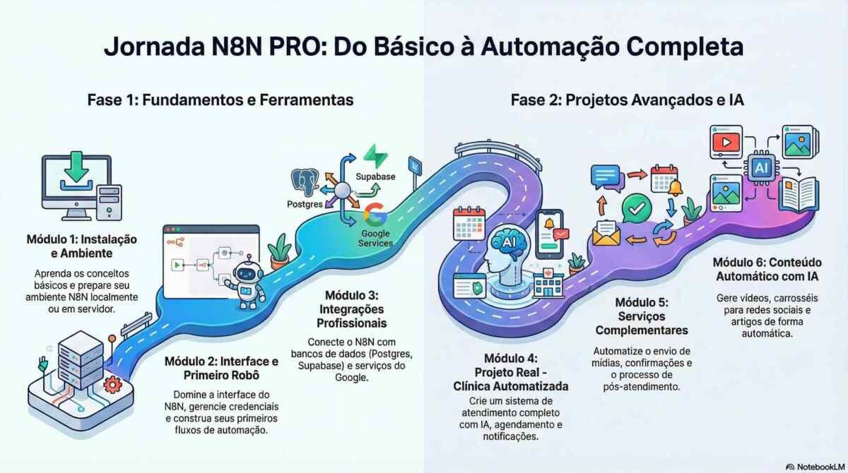Você vai aprender a instalar o N8N, integrar IA, montar fluxos reais, estruturar bancos de dados, conectar WhatsApp, Google, APIs e transformar qualquer negócio em uma operação automatizada — do atendimento ao agendamento.